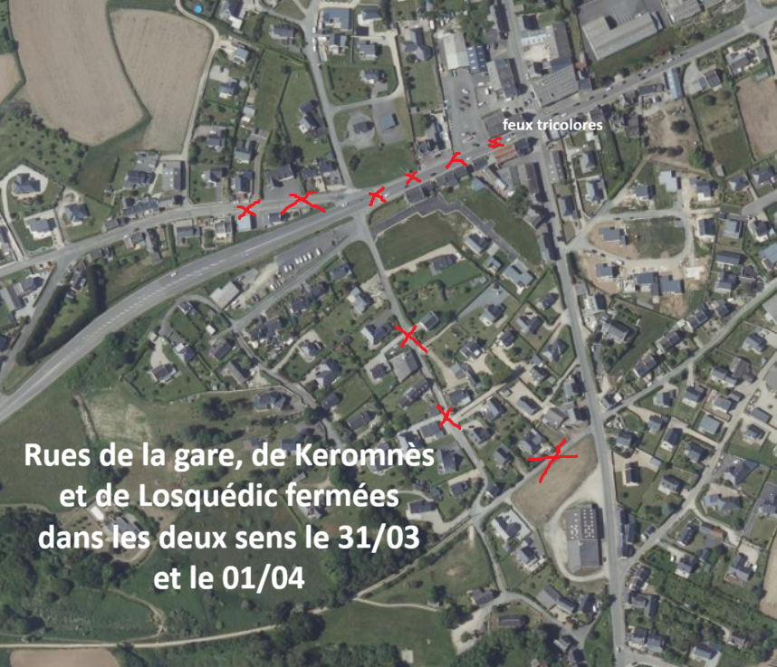 Les travaux actuels nécessitent la fermeture dans les deux sens de circulation de plusieurs rues les mardi 31 mars et mercredi 1er avril. Il s’agit de la rue de Losquédic pour le tronçon situé entre la rue du Guider et la RD 10 ; de la rue de Keromnès et de la rue de la Gare. Les usagers sont invités à emprunter la déviation mise en place par Ty Korn pour se rendre à Sibiril.