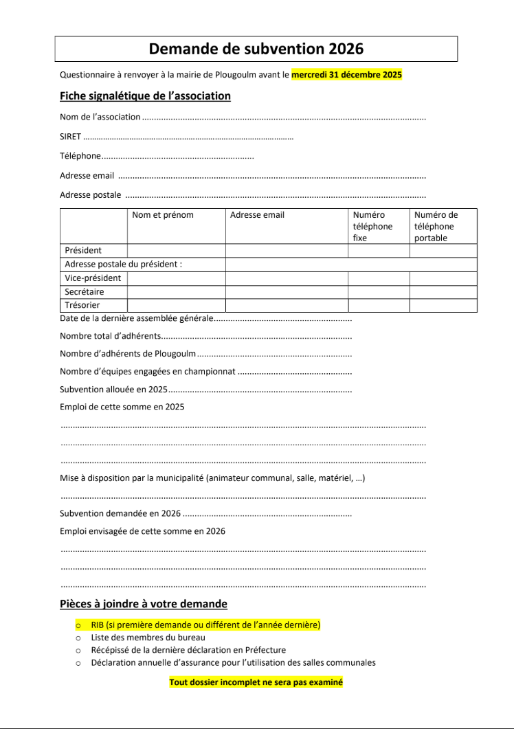 Pour toute demande de subvention auprès de la commune de Plougoulm, nous vous remercions de compléter le document de 2 pages ci-après (version pdf imprimable en cliquant dessus) et de fournir tous les justificatifs demandés.